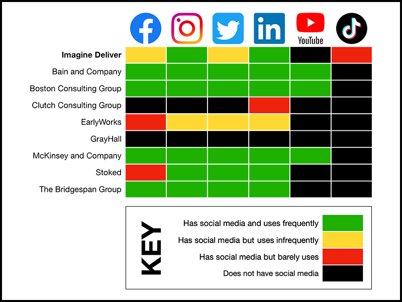 To gain a competitive perspective, a comprehensive deep dive into Imagine Deliver’s website and competitors’ platforms was conducted. This was followed by an analysis of social media strategies across competitors to identify the most effective channels for engagement. A user survey on social media usage was conducted on Instagram, led by Grace and Nicole, to gather insights into preferred platforms and content types.